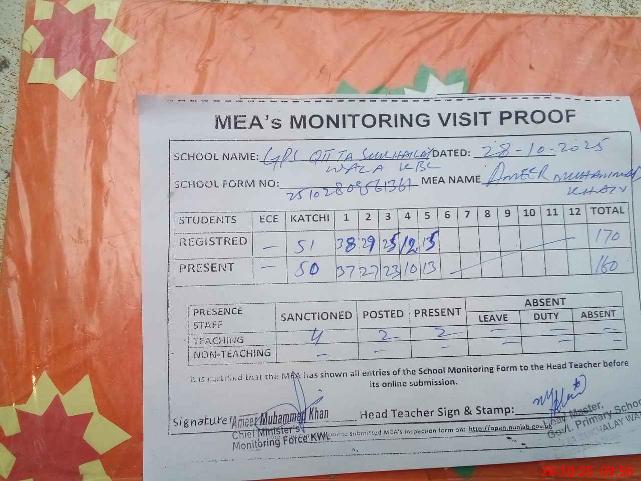 | Attendance Register | Head Teacher | MEA with School | Visit Proof |