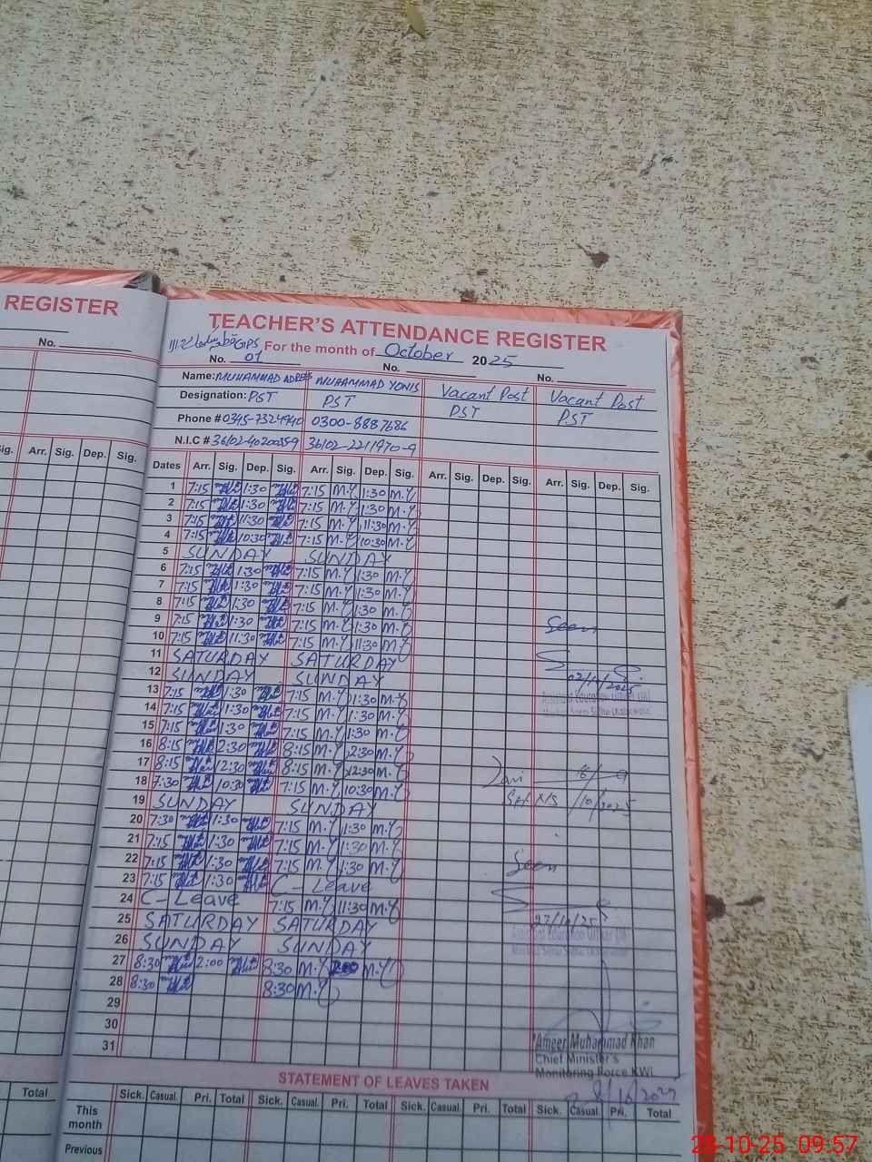 | CNIC | Full Name | Designation | R/C | Absence during last cal. month |