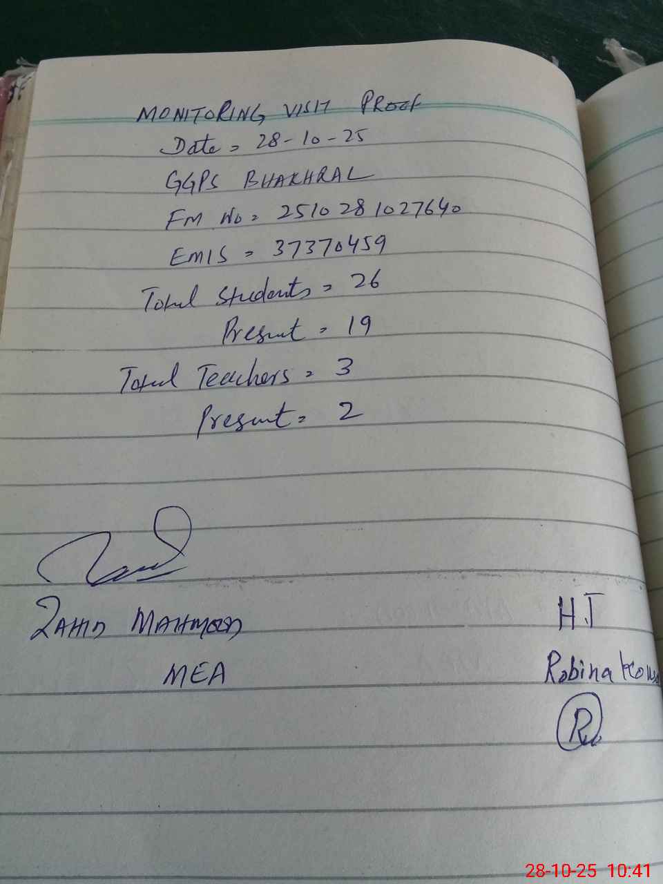 | Attendance Register | Head Teacher | MEA with School | Visit Proof |