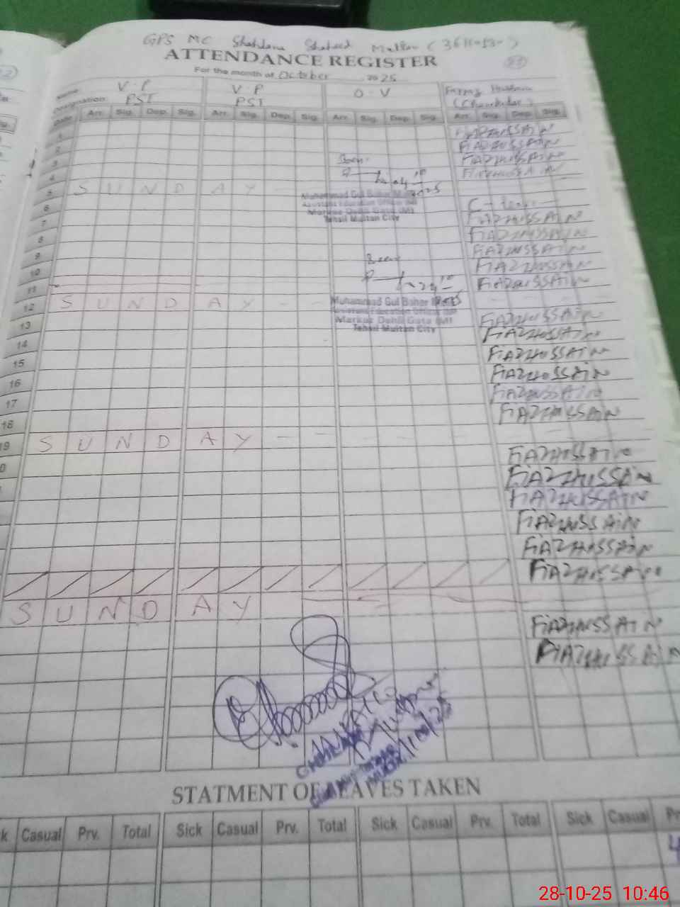 | CNIC | Full Name | Designation | R/C | Absence During Last Calender Month |