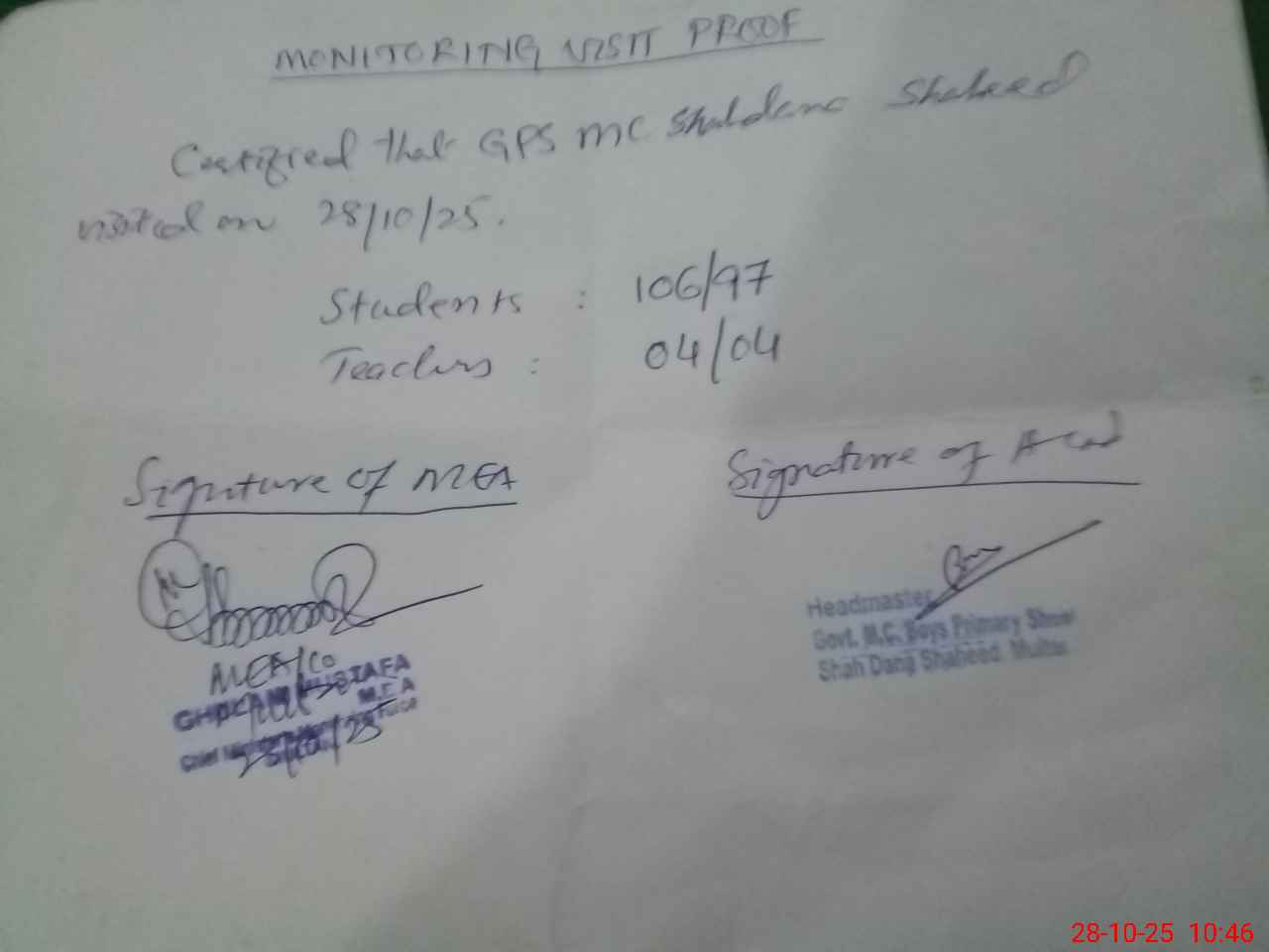 | Certified that this School was Inspected by the Undersigned MEA/DMO Today and the Information Stated Above is as Per Record. | |||||