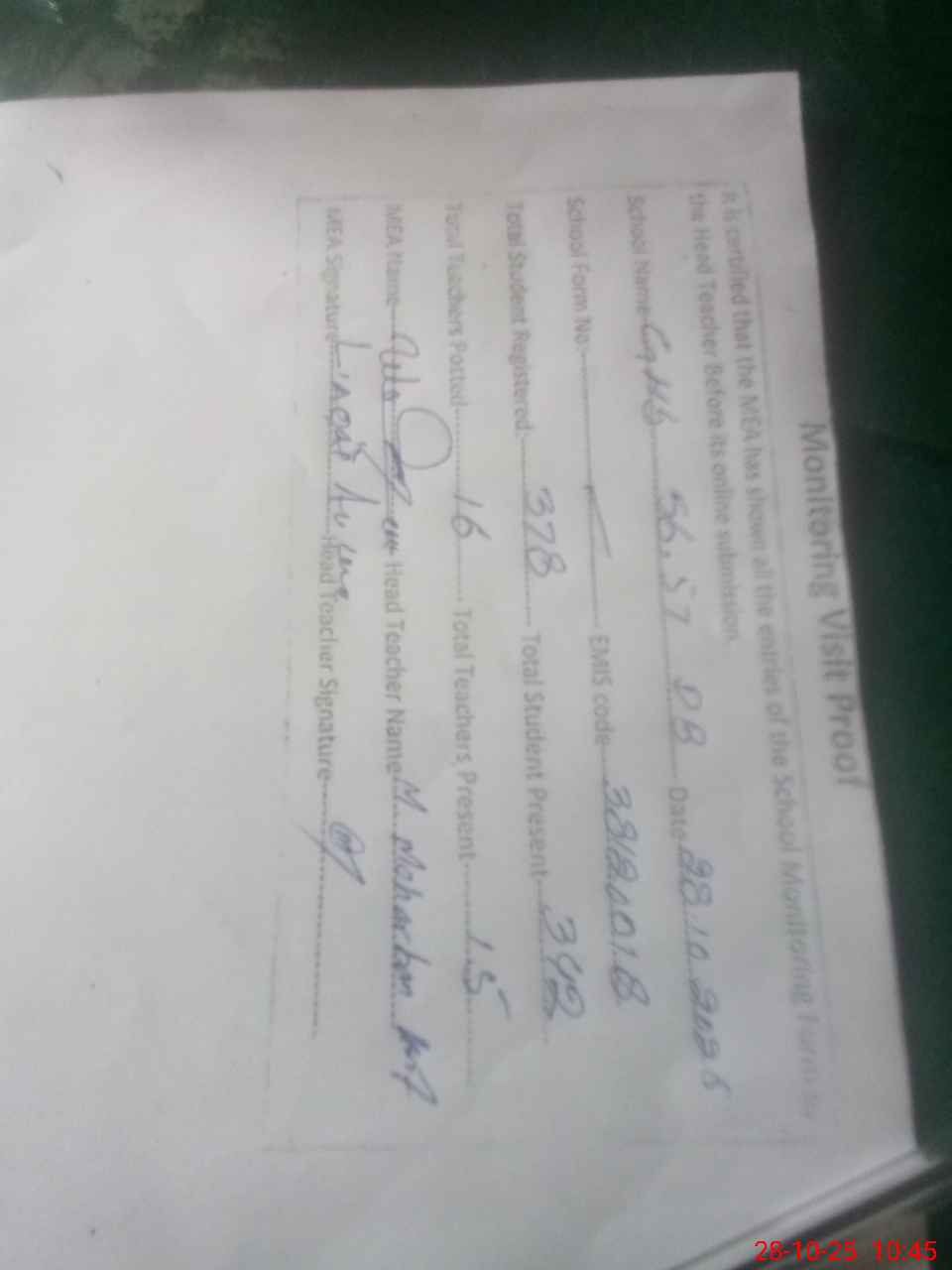 | Attendance Register | Head Teacher | MEA with School | Visit Proof |