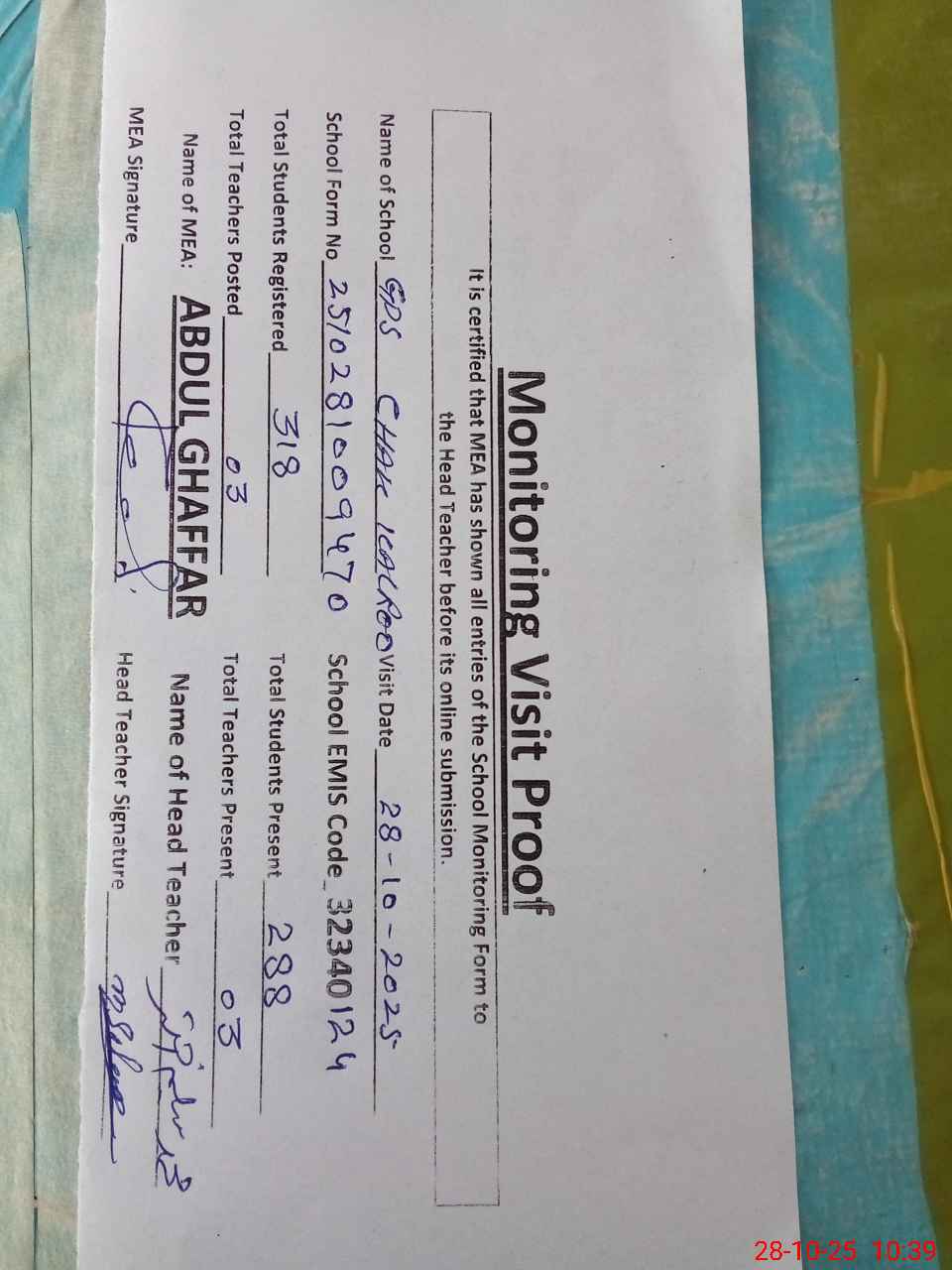 | Attendance Register | Head Teacher | MEA with School | Visit Proof |