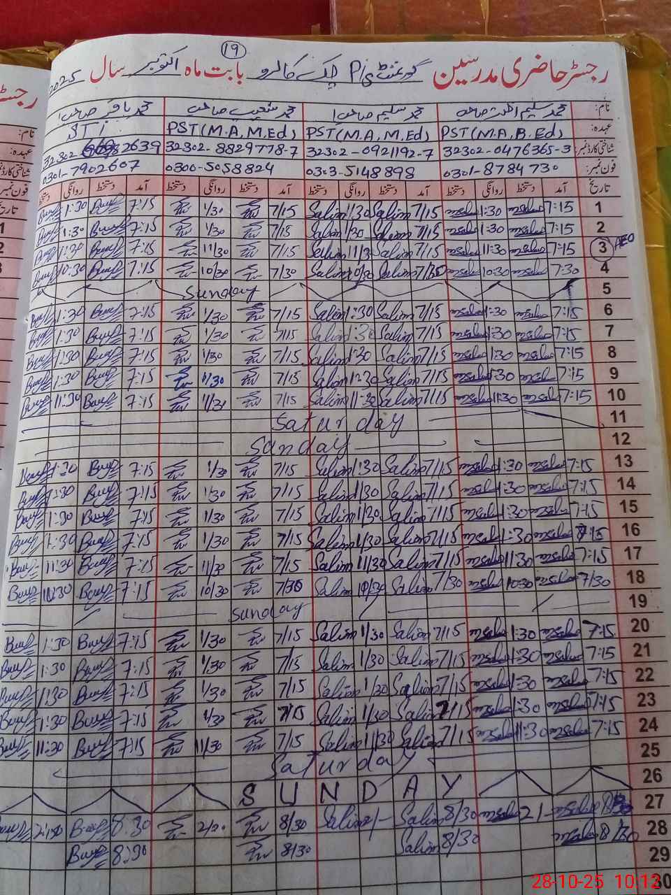 | CNIC | Full Name | Designation | R/C | Absence During Last Calender Month |