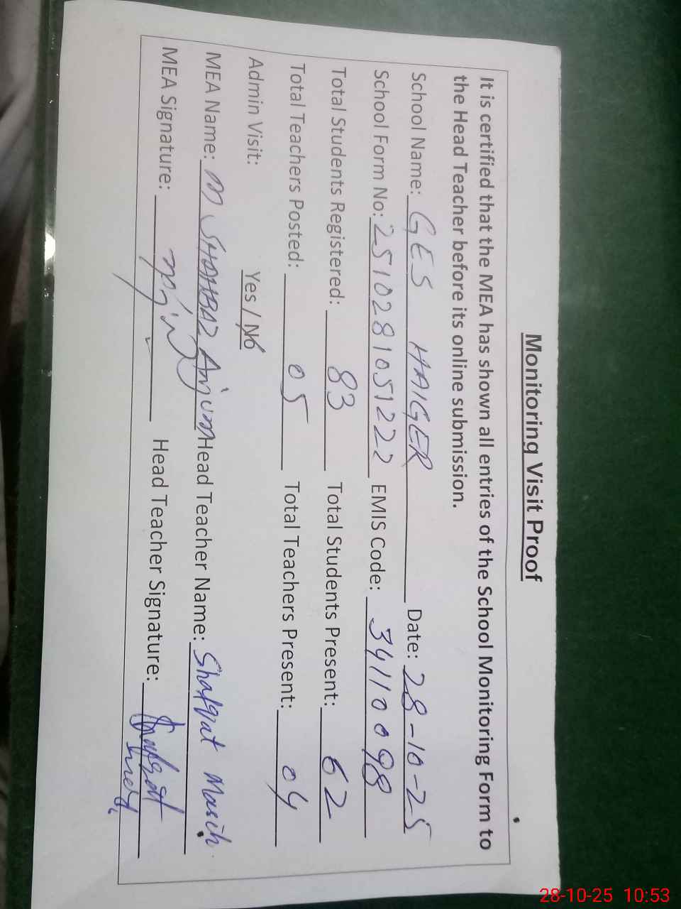 | Certified that this School was Inspected by the Undersigned MEA/DMO Today and the Information Stated Above is as Per Record. | |||||