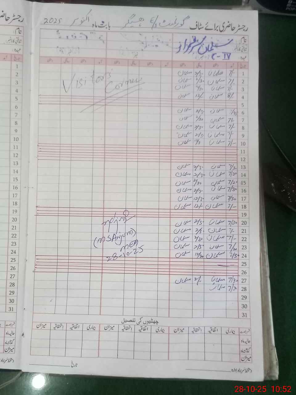 | Total no. of Classrooms: 7 No. of Classrooms Used for Teaching: 4 No. of Classrooms Storing Old Furniture, FTBs, etc: 0Comments if Any: AVERAGE CONDITION OF BUILDING AND SCHOOL NSB AND FTF RECORD WELL MAINTAINED IN REGISTER BUT NOT BEING MAINTAINED IN TAB COVID SOPS DISPLAYED AND PARTIALLY FOLLOWING BY STAFF AND STUDENTS TEMPERATURE GUN AVAILABLE ROZNAMCHA IS JUST NOT BEING MAINTAINED |