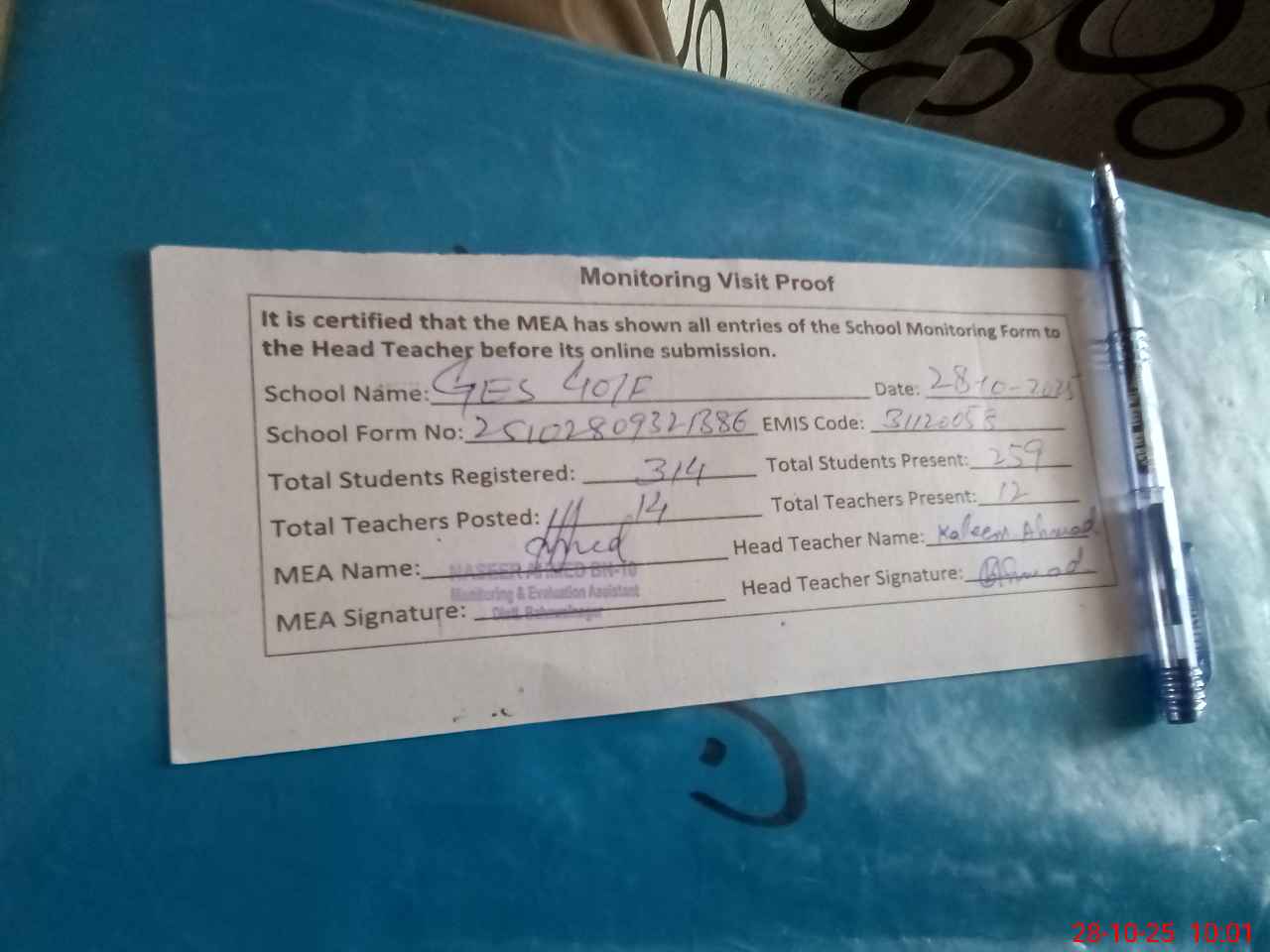 | Attendance Register | Head Teacher | MEA with School | Visit Proof |