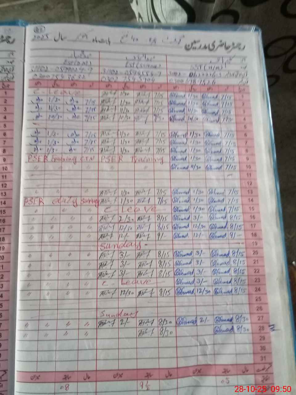 | CNIC | Full Name | Designation | R/C | Absence During Last Calender Month |
