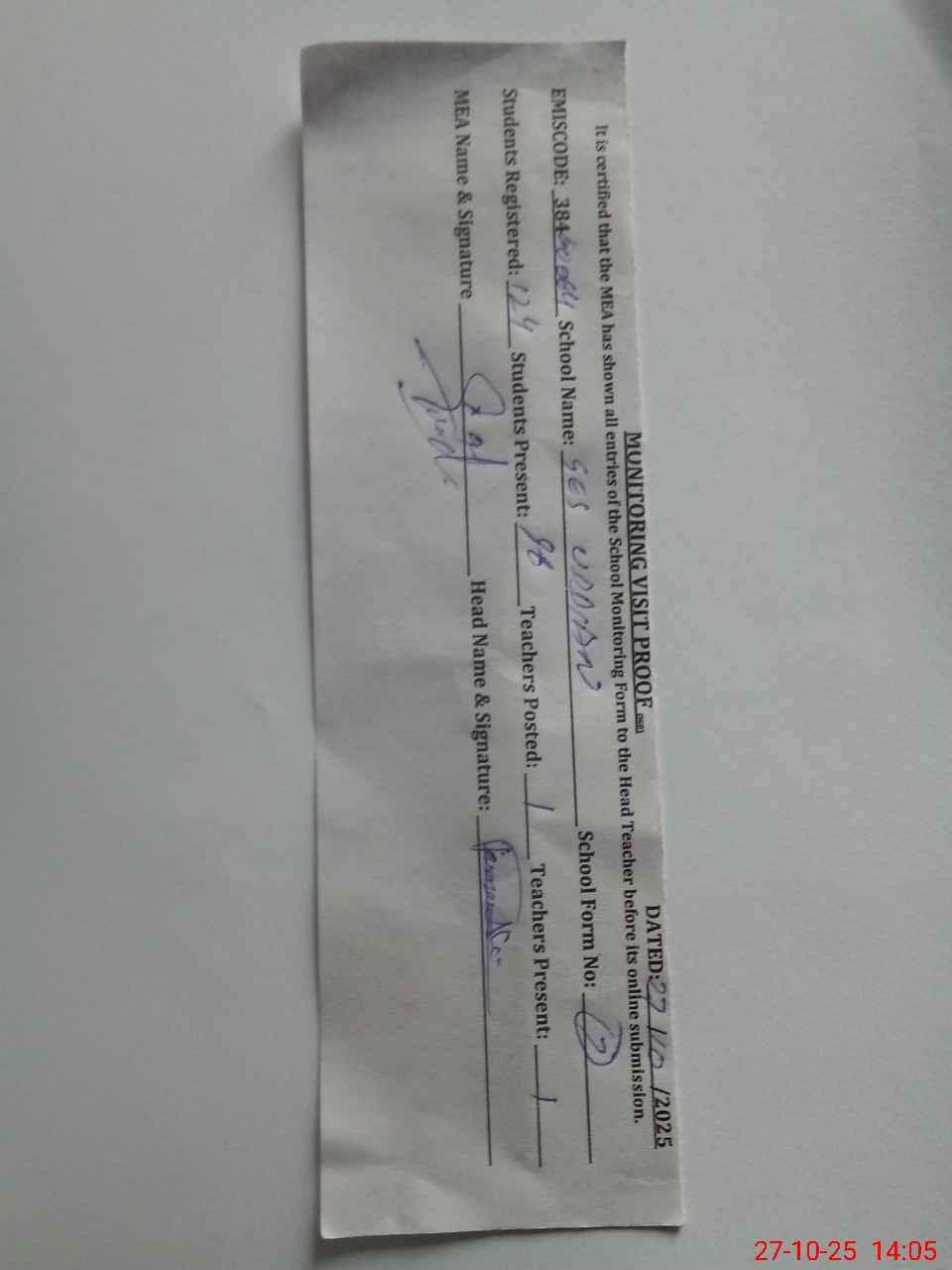 | Attendance Register | Head Teacher | MEA with School | Visit Proof |