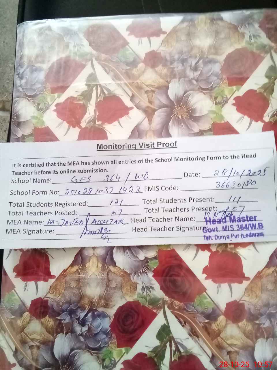 | Certified that this School was Inspected by the Undersigned MEA/DMO Today and the Information Stated Above is as Per Record. | |||||