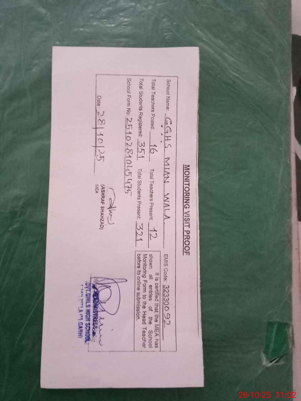 | EMIS Code: 32330092 | Name of School: GGHS MIAN WALA | |||