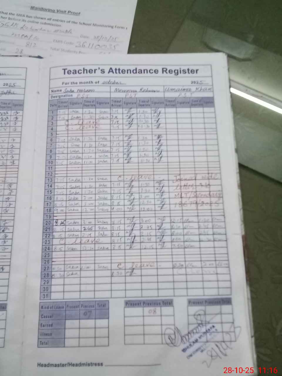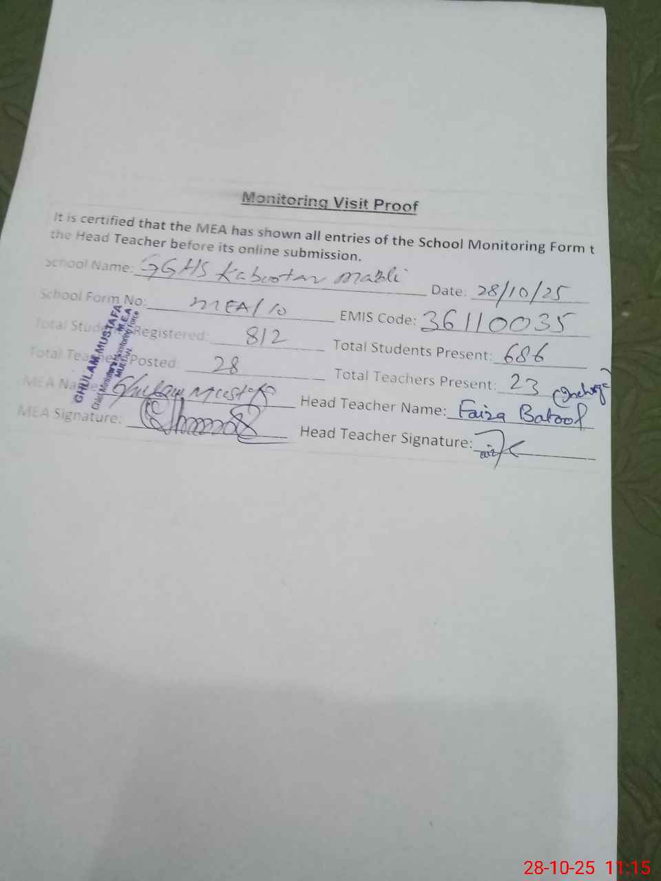 | Attendance Register | Head Teacher | MEA with School | Visit Proof |