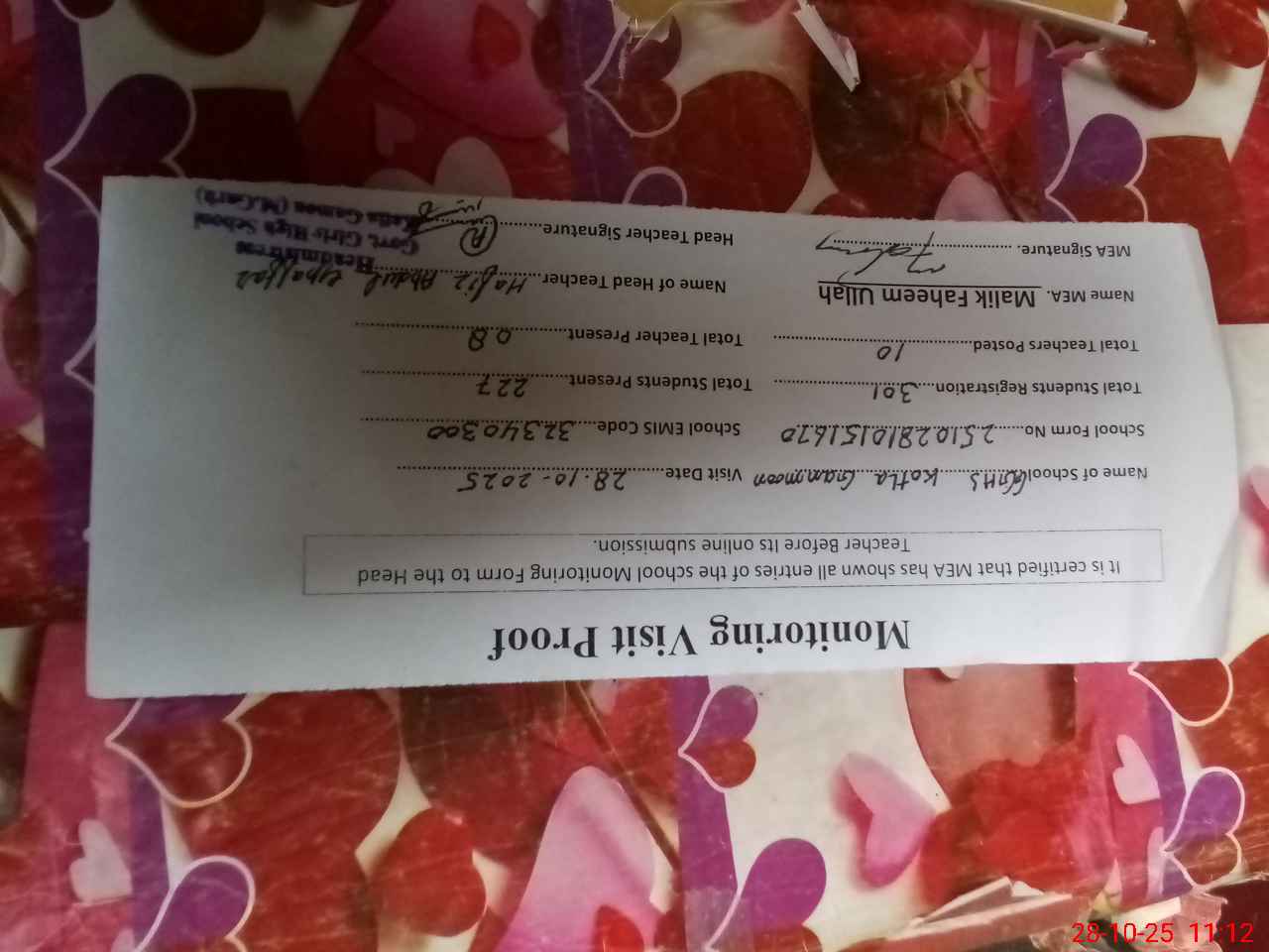 | Certified that this School was Inspected by the Undersigned MEA/DMO Today and the Information Stated Above is as Per Record. | |||||
