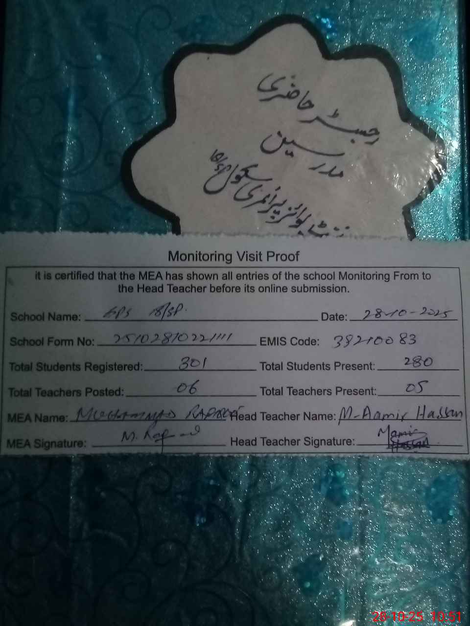 | Attendance Register | Head Teacher | MEA with School | Visit Proof |