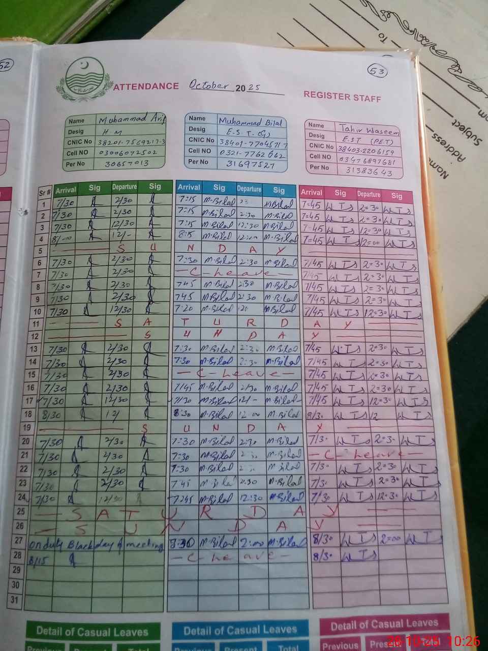 | CNIC | Full Name | Designation | R/C | Absence during last cal. month |