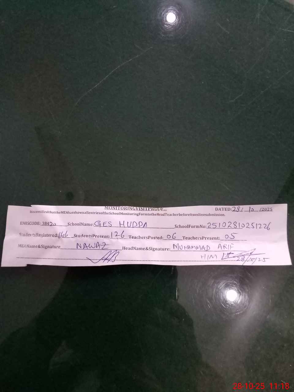 | Attendance Register | Head Teacher | MEA with School | Visit Proof |