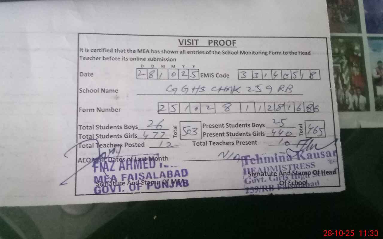 | EMIS Code: 33140518 | Name of School: GGHS CHAK 259 RB GOROSAR | |||