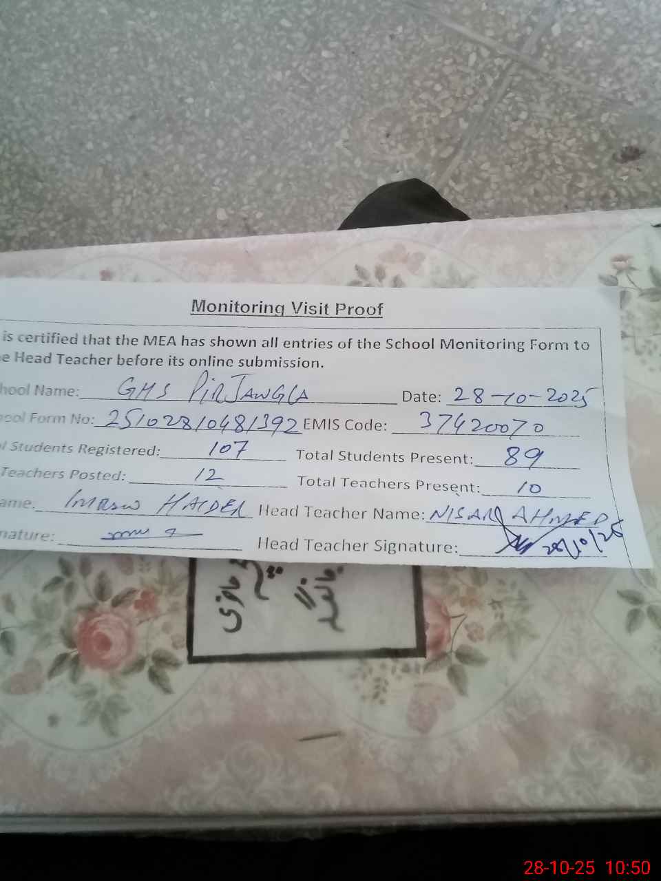 | Attendance Register | Head Teacher | MEA with School | Visit Proof |