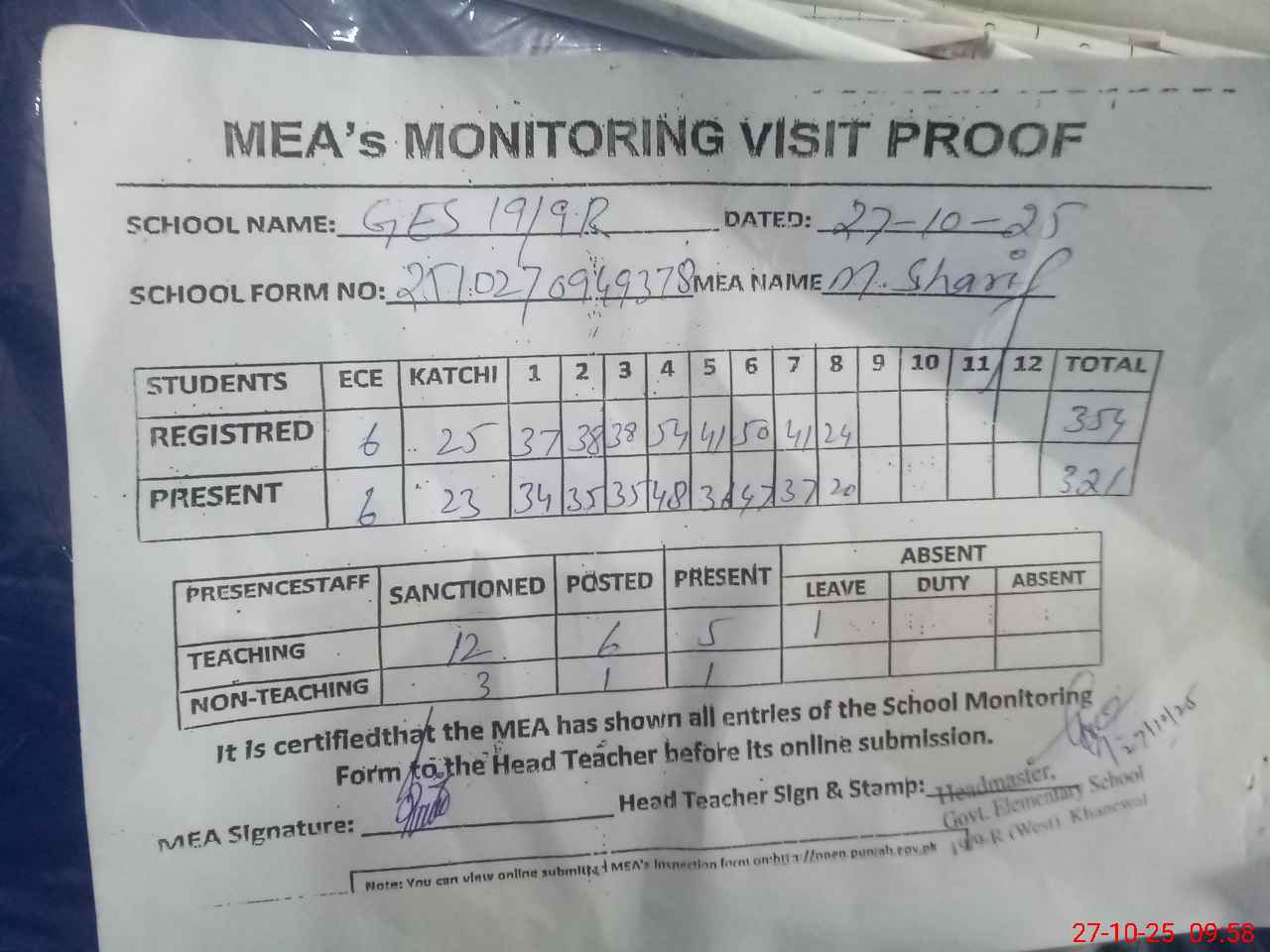 | Attendance Register | Head Teacher | MEA with School | Visit Proof |