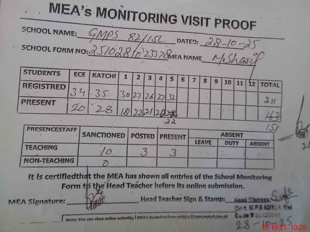 | Certified that this School was Inspected by the Undersigned MEA/DMO Today and the Information Stated Above is as Per Record. | |||||