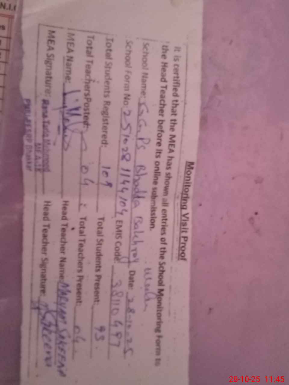 | Attendance Register | Head Teacher | MEA with School | Visit Proof |