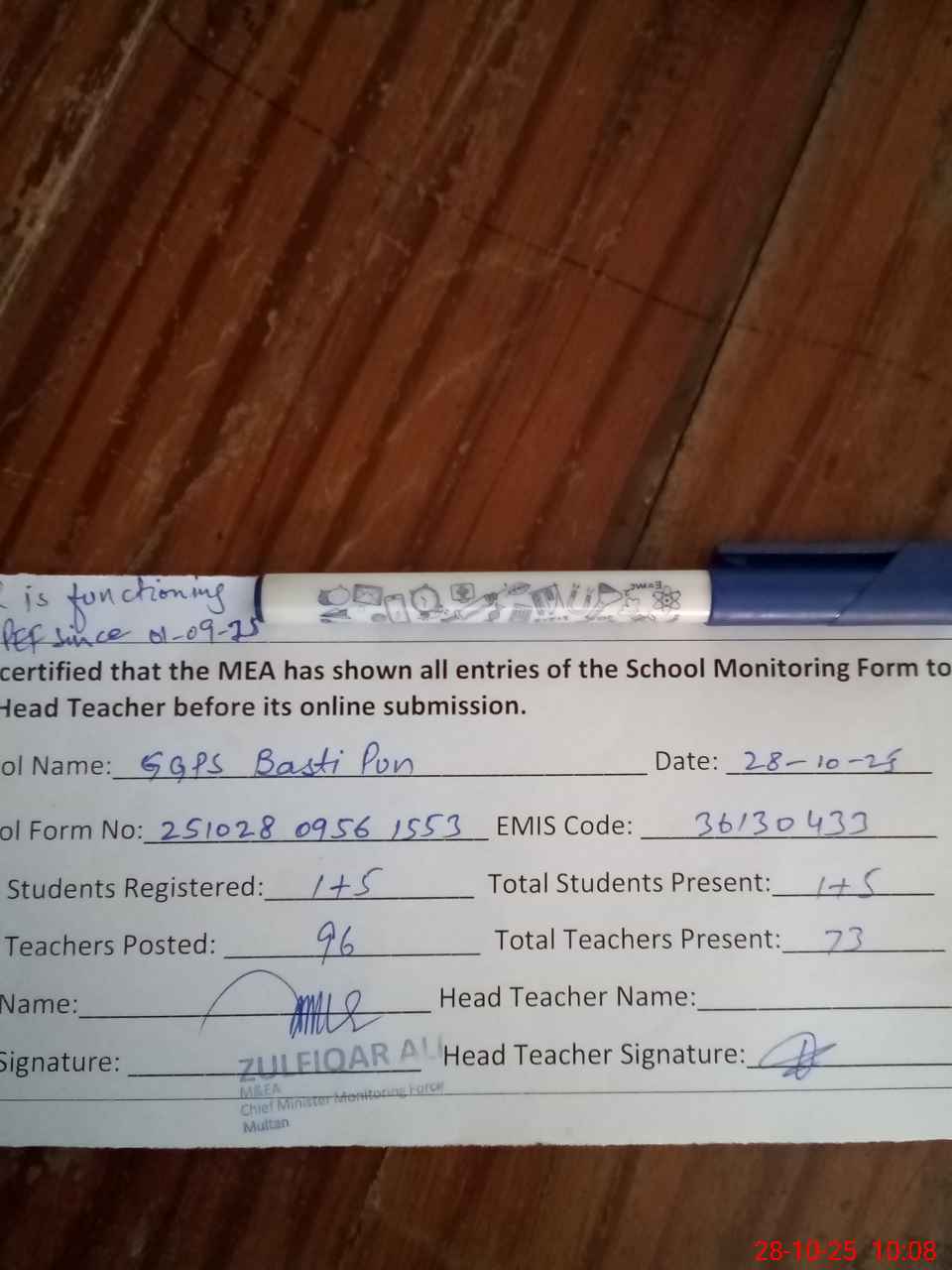 | Monitoring Date: 28-10-2025 | Start Time: 28-10-2025 09:56 AM | End Time: 28-10-2025 10:10 AM | Name of MEA: Zu**** Al**** | |