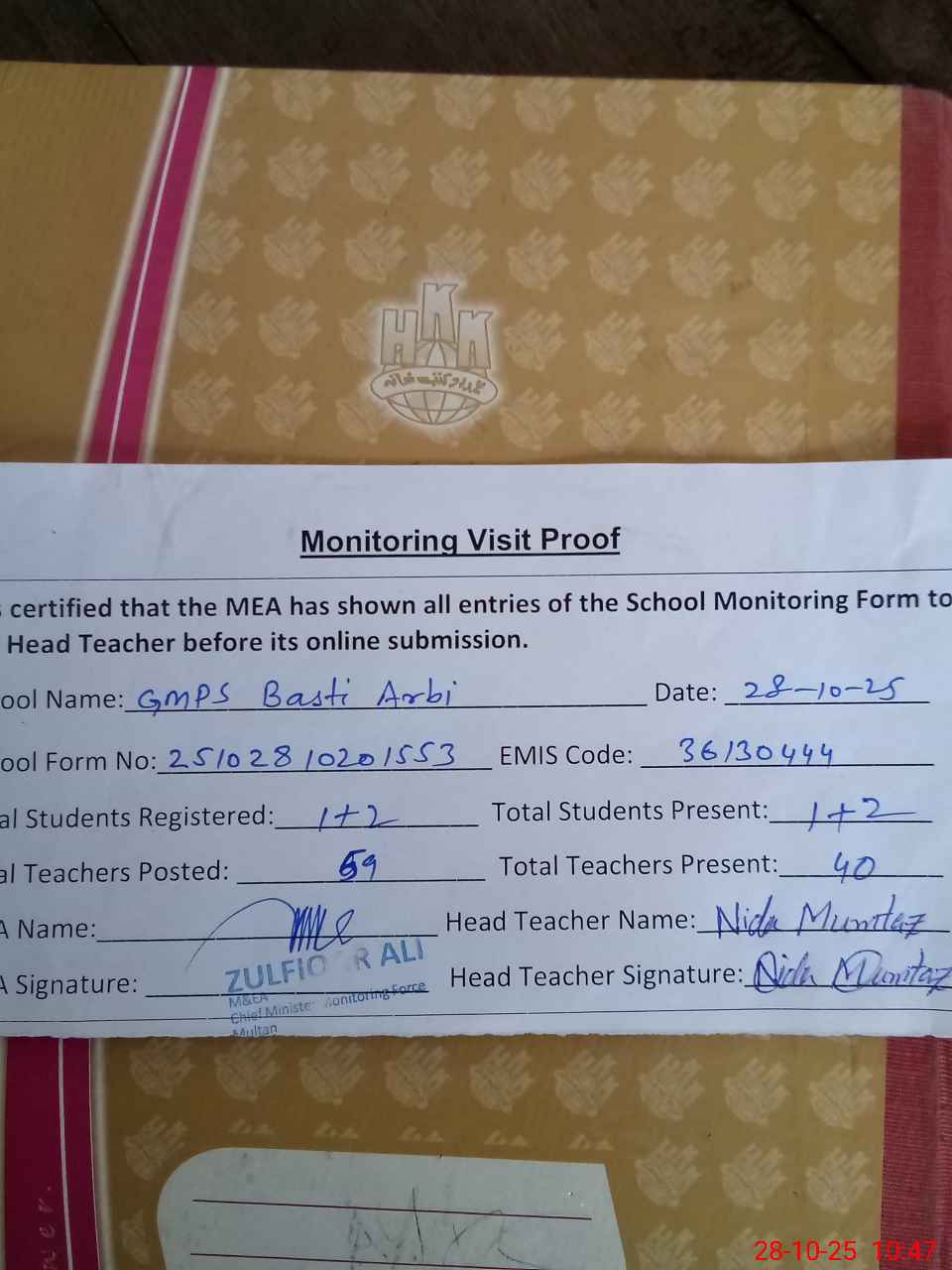 | Attendance Register | Head Teacher | MEA with School | Visit Proof |