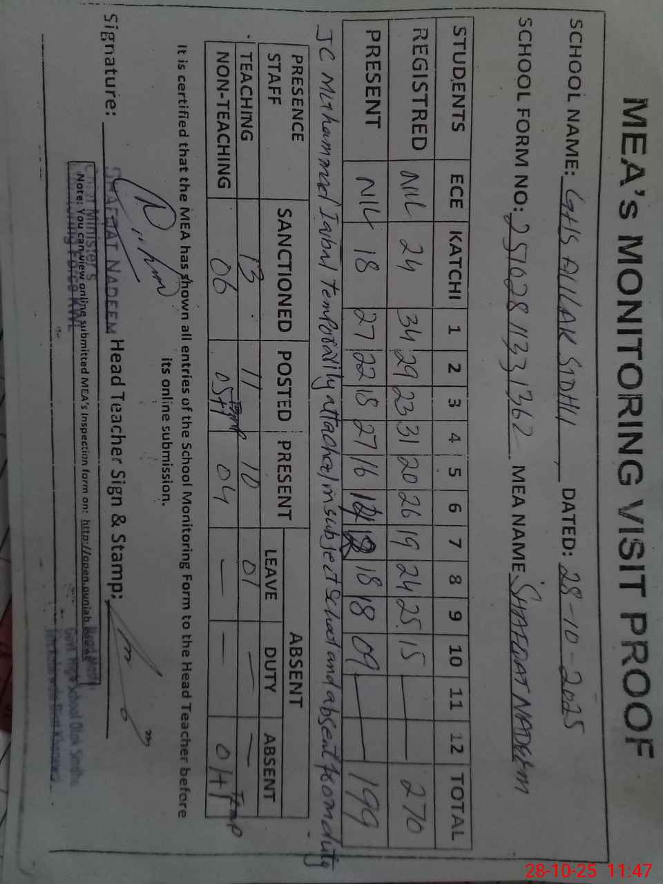 | Attendance Register | Head Teacher | MEA with School | Visit Proof |