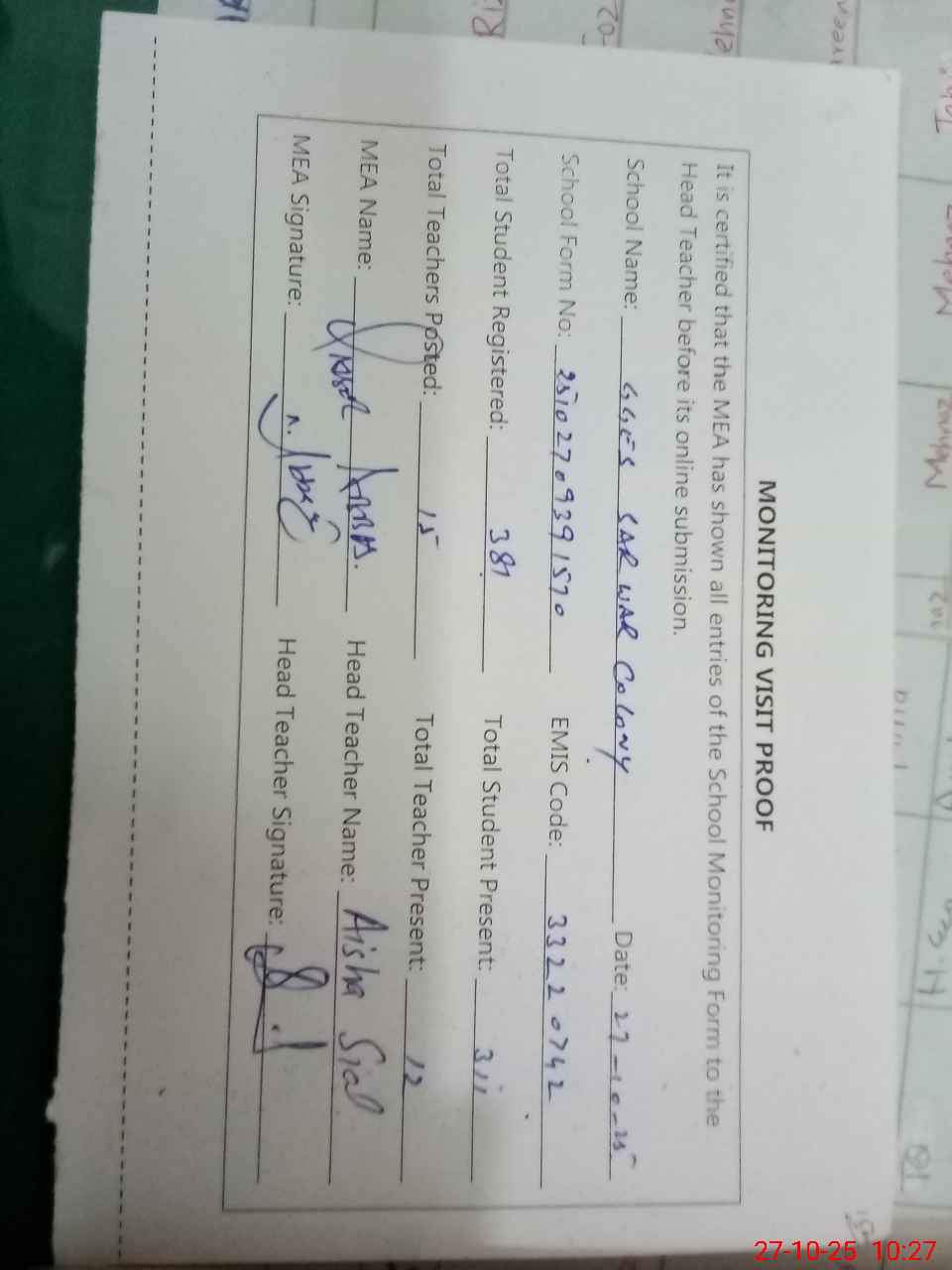 | Attendance Register | Head Teacher | MEA with School | Visit Proof |