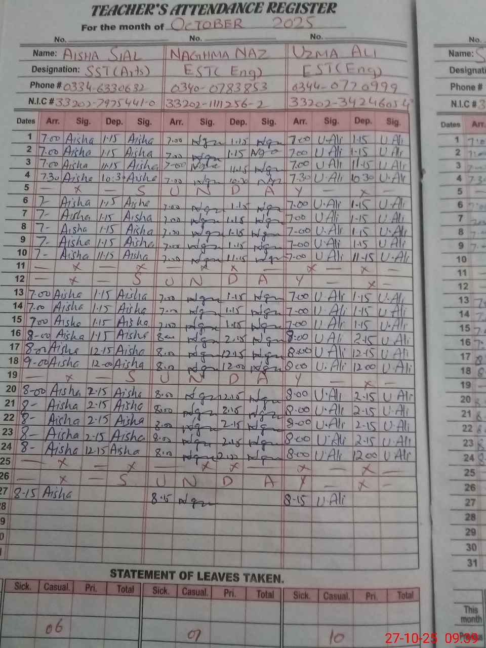 | CNIC | Full Name | Designation | R/C | Absence during last cal. month |