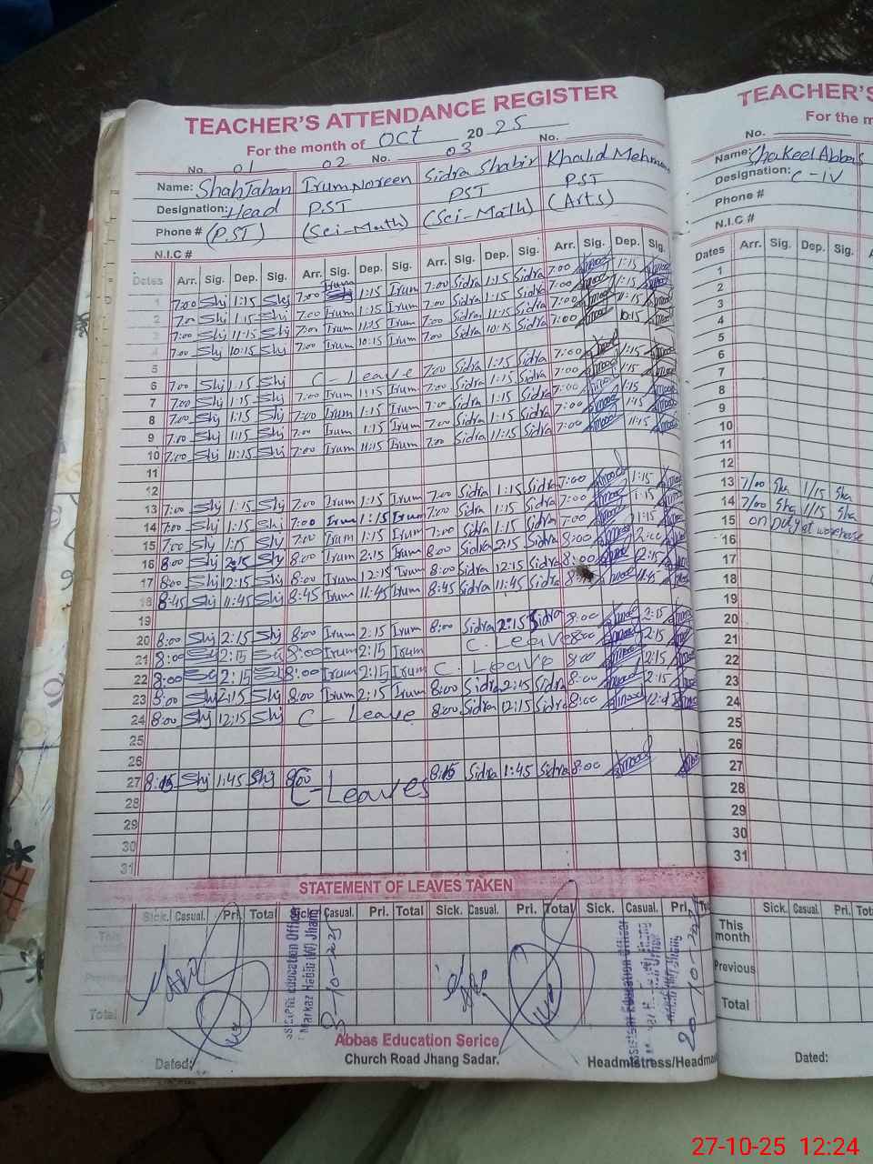 | 12**** | Sh**** Ab**** | C 4 | 0 | 0 | 19 | 0 | 0 | 0 | 0 | 0 | 0 | Absent (Un-Authorized) | |