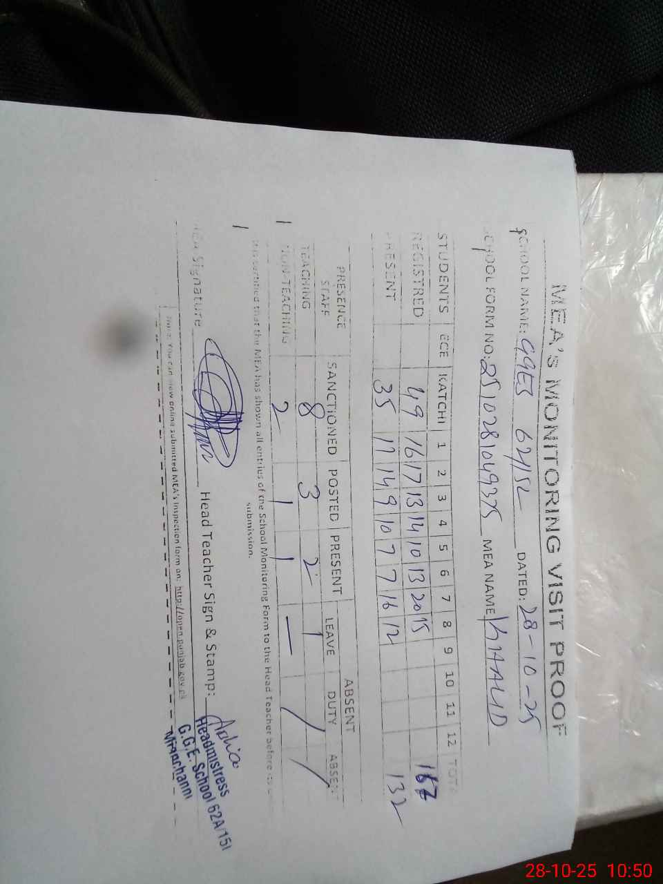 | Attendance Register | Head Teacher | MEA with School | Visit Proof |