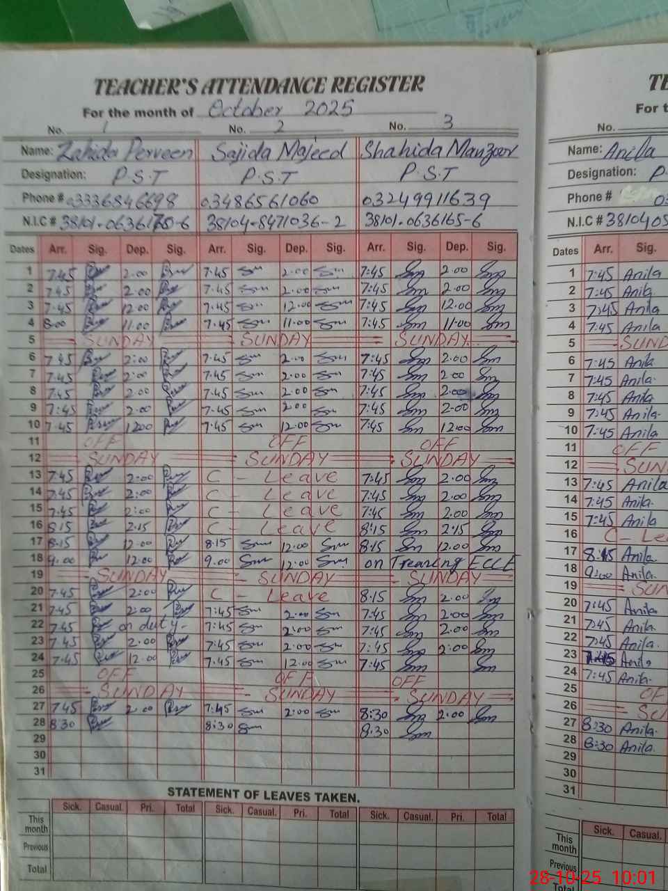 | CNIC | Full Name | Designation | R/C | Absence During Last Calender Month |