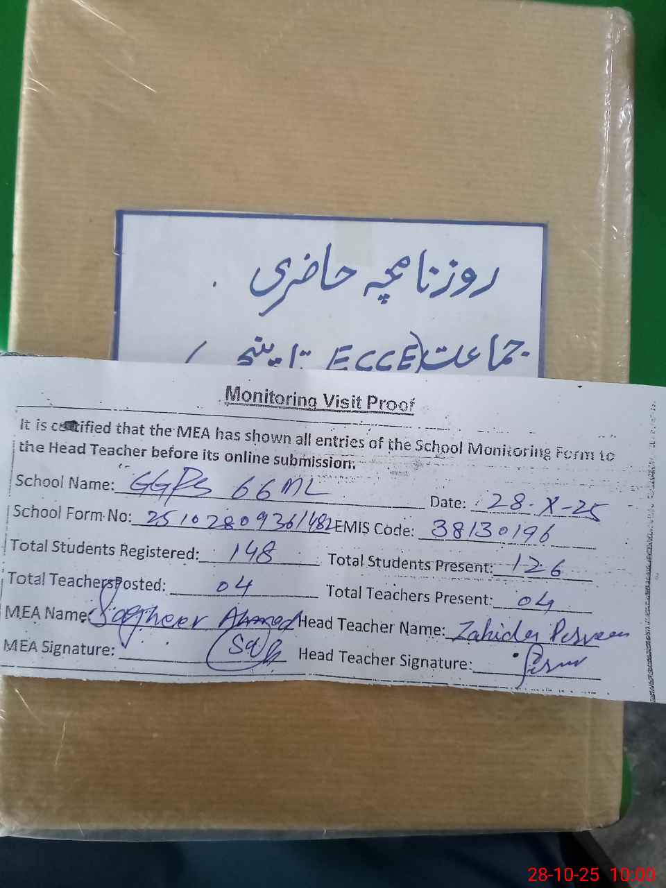 | Attendance Register | Head Teacher | MEA with School | Visit Proof |