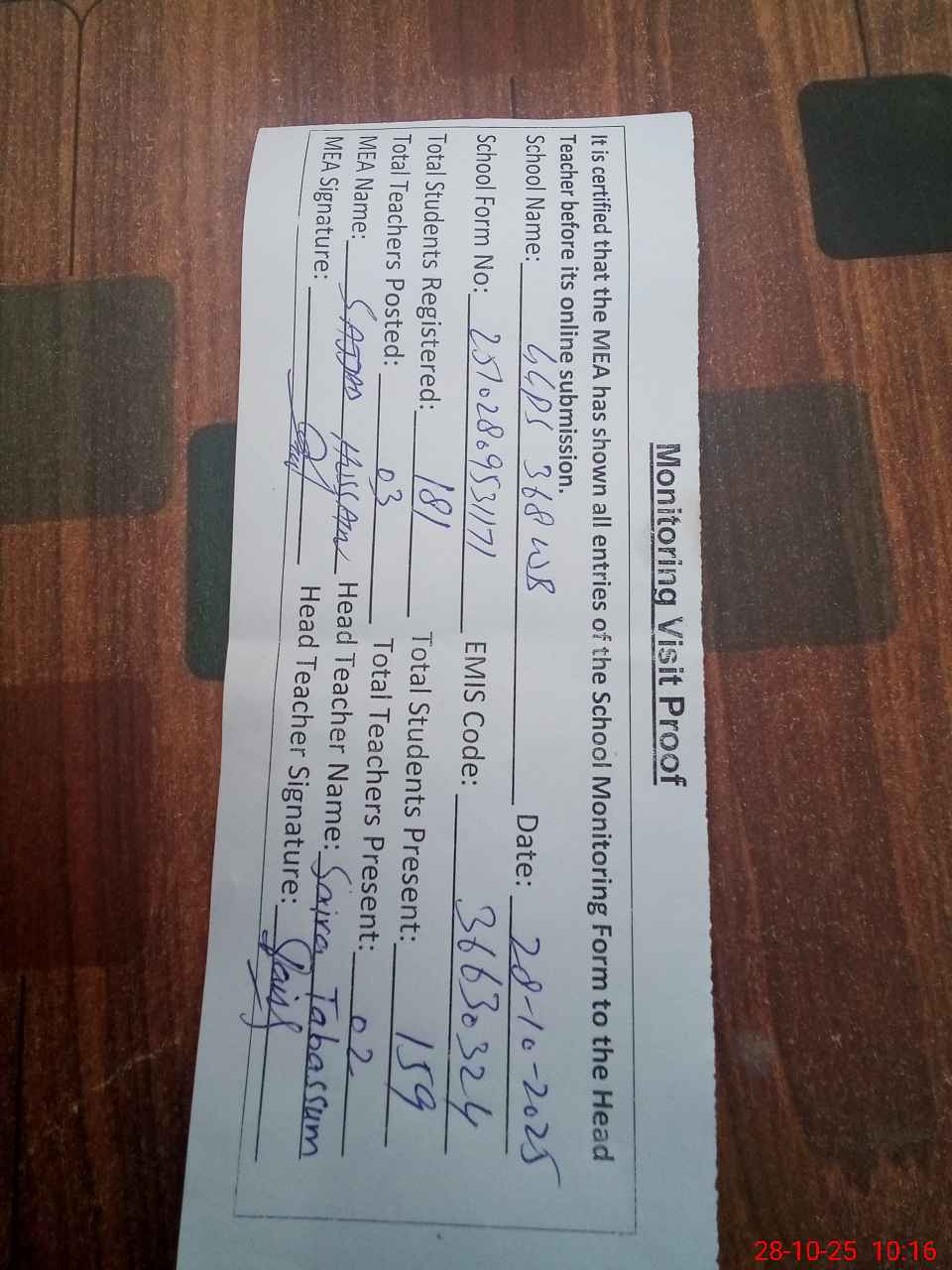 | Attendance Register | Head Teacher | MEA with School | Visit Proof |