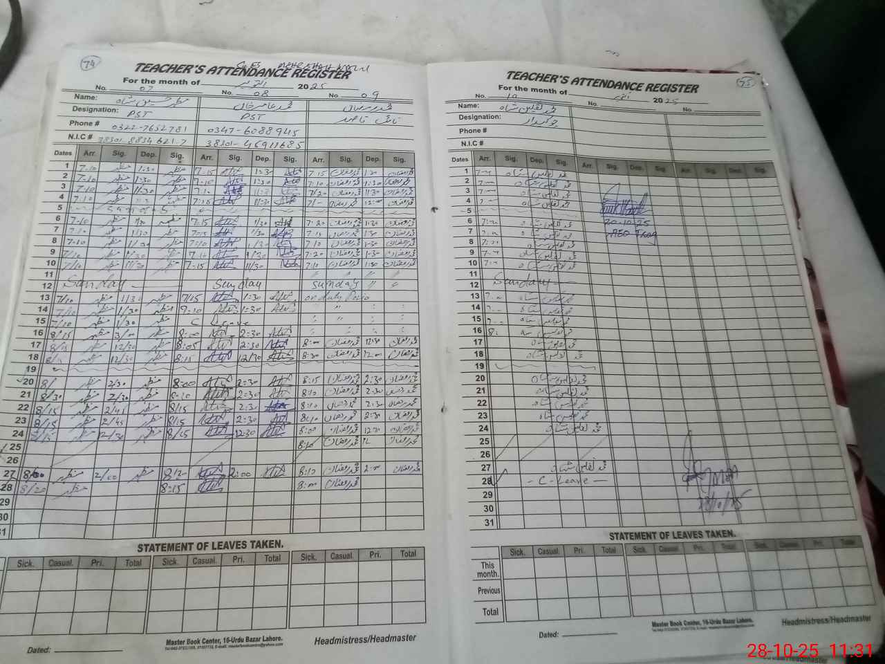 | CNIC | Full Name | Designation | R/C | Absence During Last Calender Month |