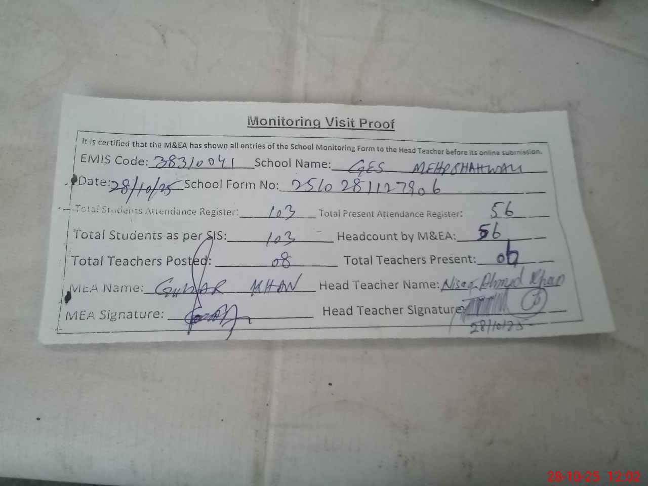 | Attendance Register | Head Teacher | MEA with School | Visit Proof |