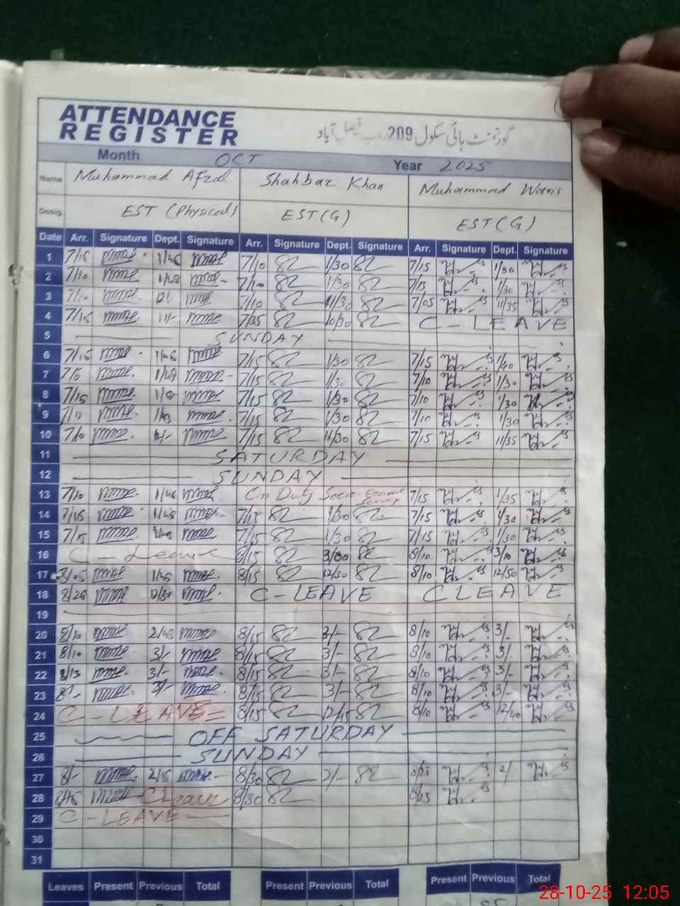 | CNIC | Full Name | Designation | R/C | Absence during last cal. month |