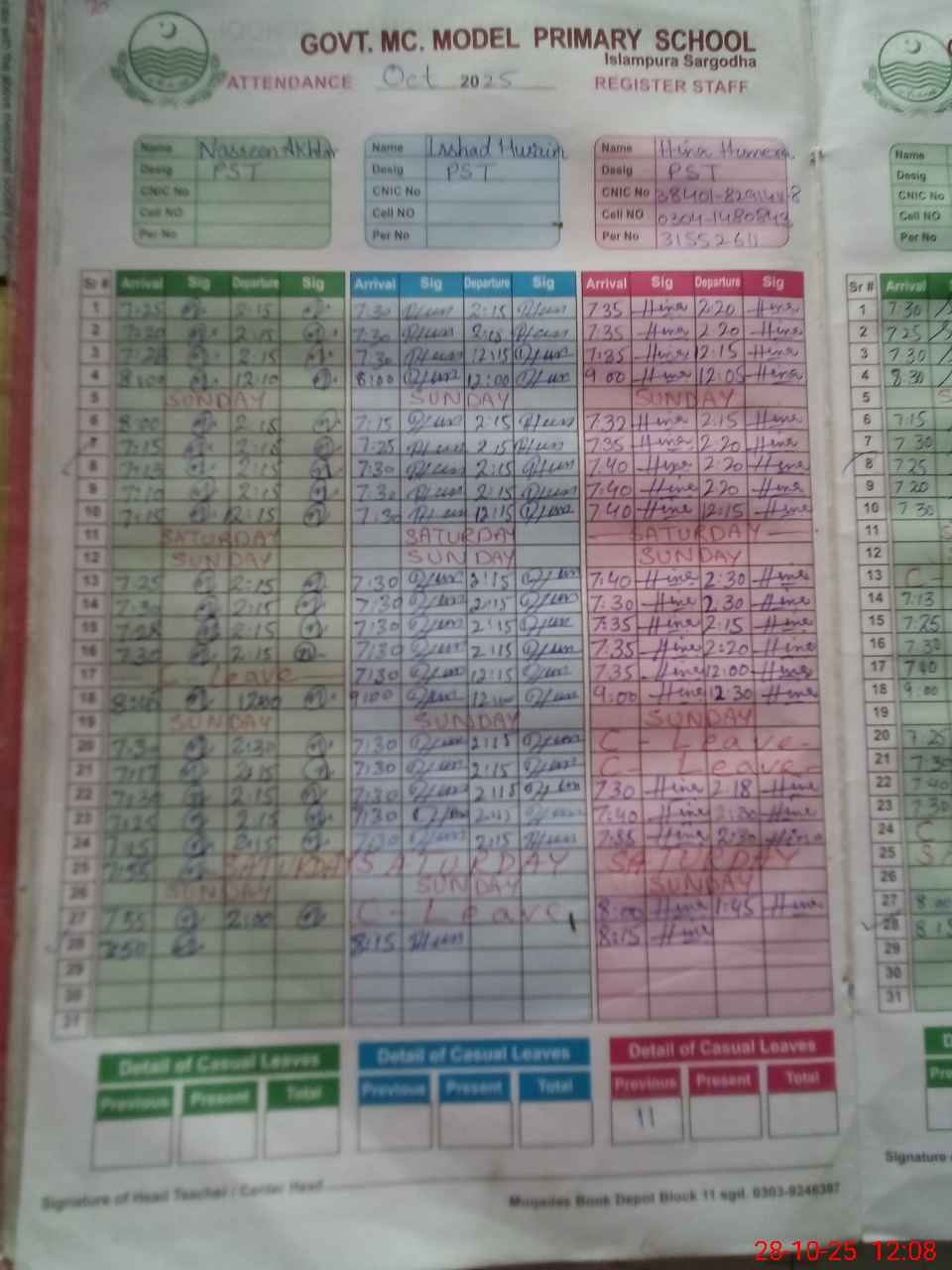 | CNIC | Full Name | Designation | R/C | Absence During Last Calender Month |