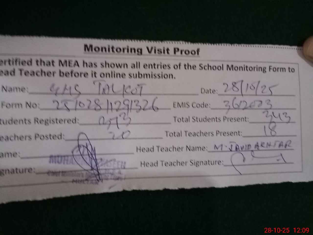 | Attendance Register | Head Teacher | MEA with School | Visit Proof |