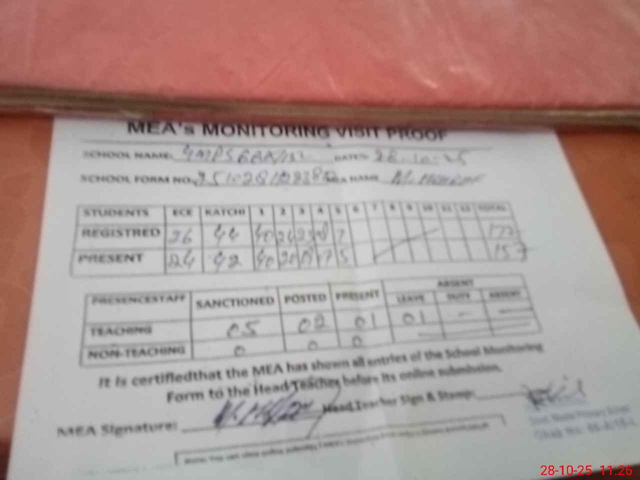 | Attendance Register | Head Teacher | MEA with School | Visit Proof |