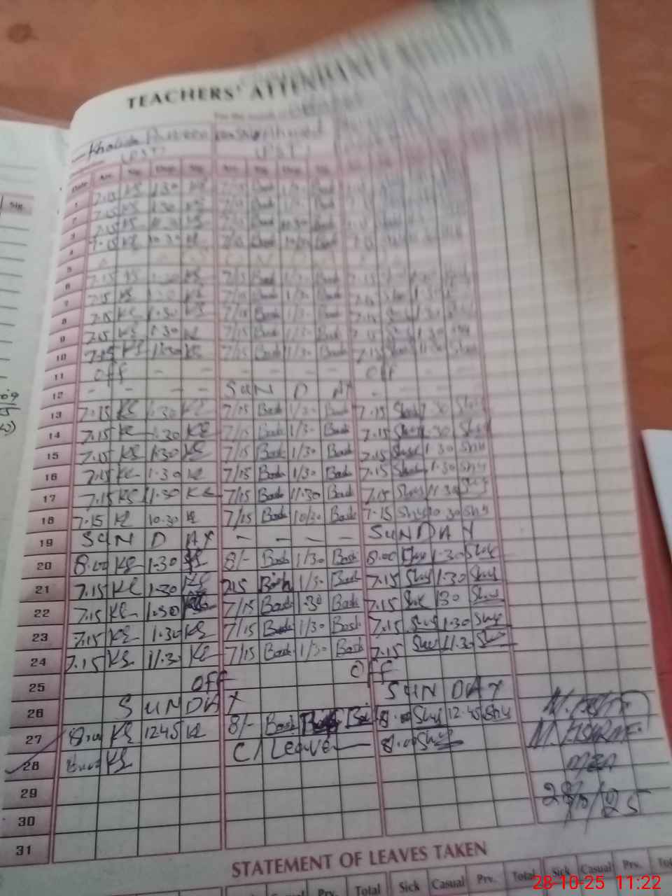 | Leave | Duty | Absent | Maternity | Medical | Ex- Pak |