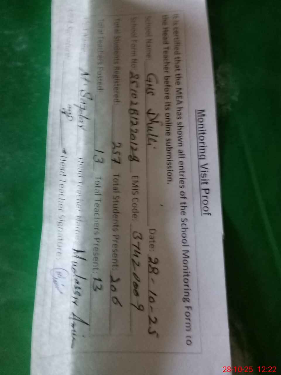 | Attendance Register | Head Teacher | MEA with School | Visit Proof |