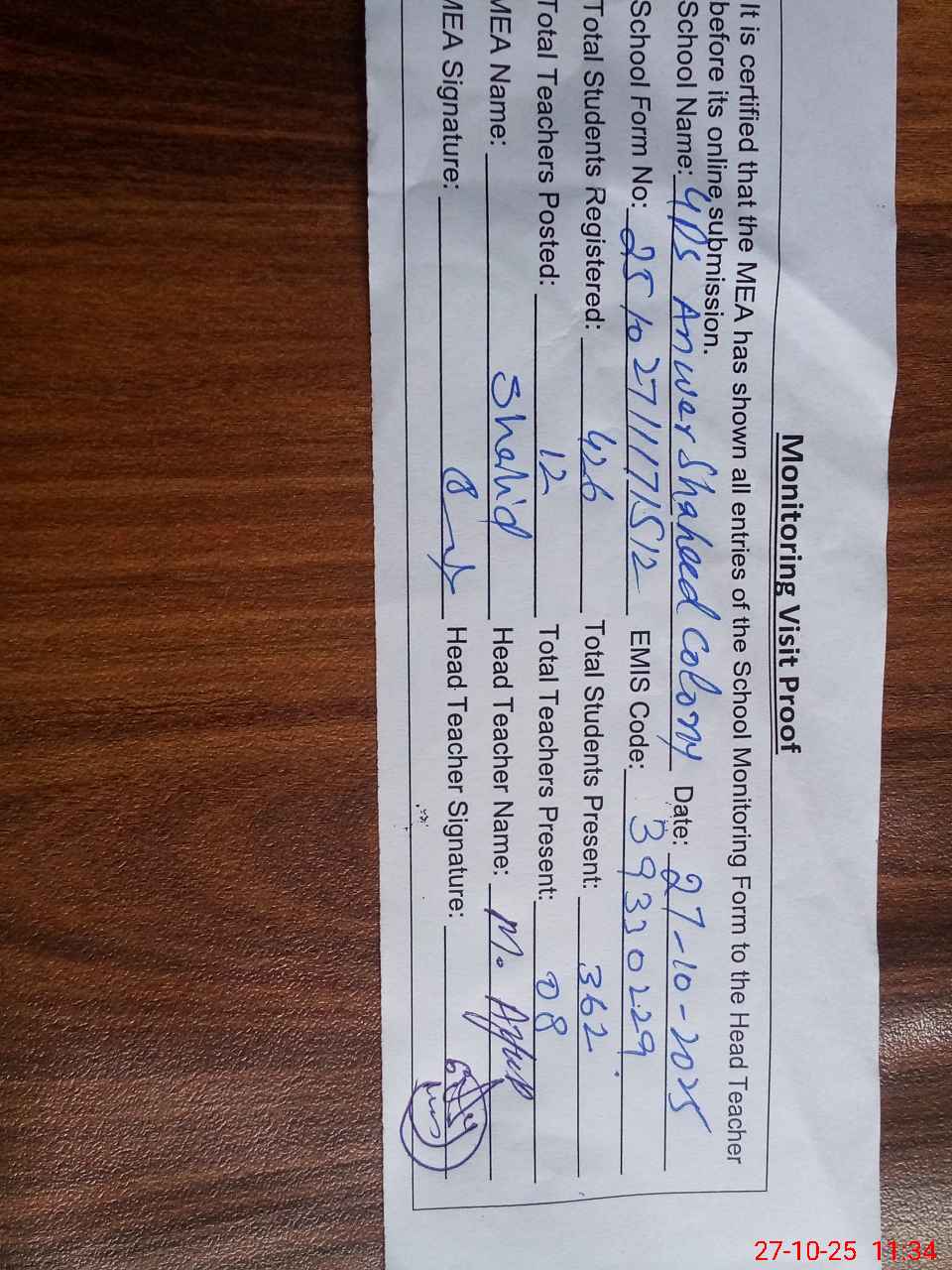 | EMIS Code: 39330229 | Name of School: GPS ANWAR SHAHEED COLONY | |||