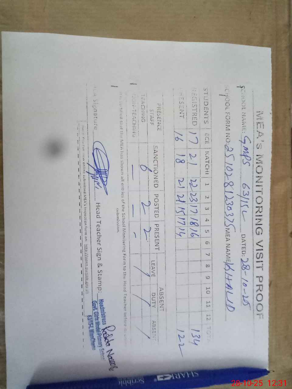 | Attendance Register | Head Teacher | MEA with School | Visit Proof |