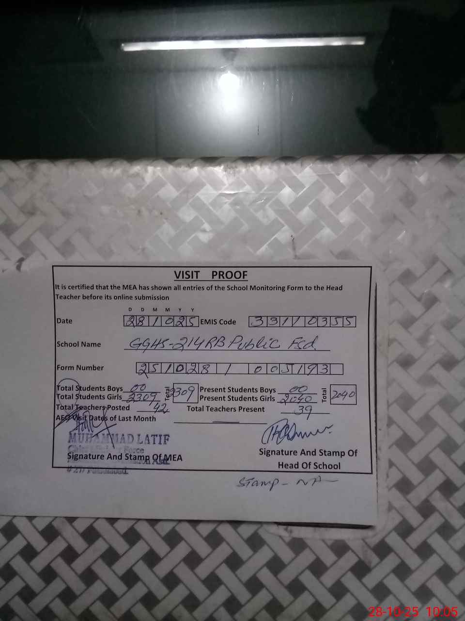 | Certified that this School was Inspected by the Undersigned MEA/DMO Today and the Information Stated Above is as Per Record. | |||||