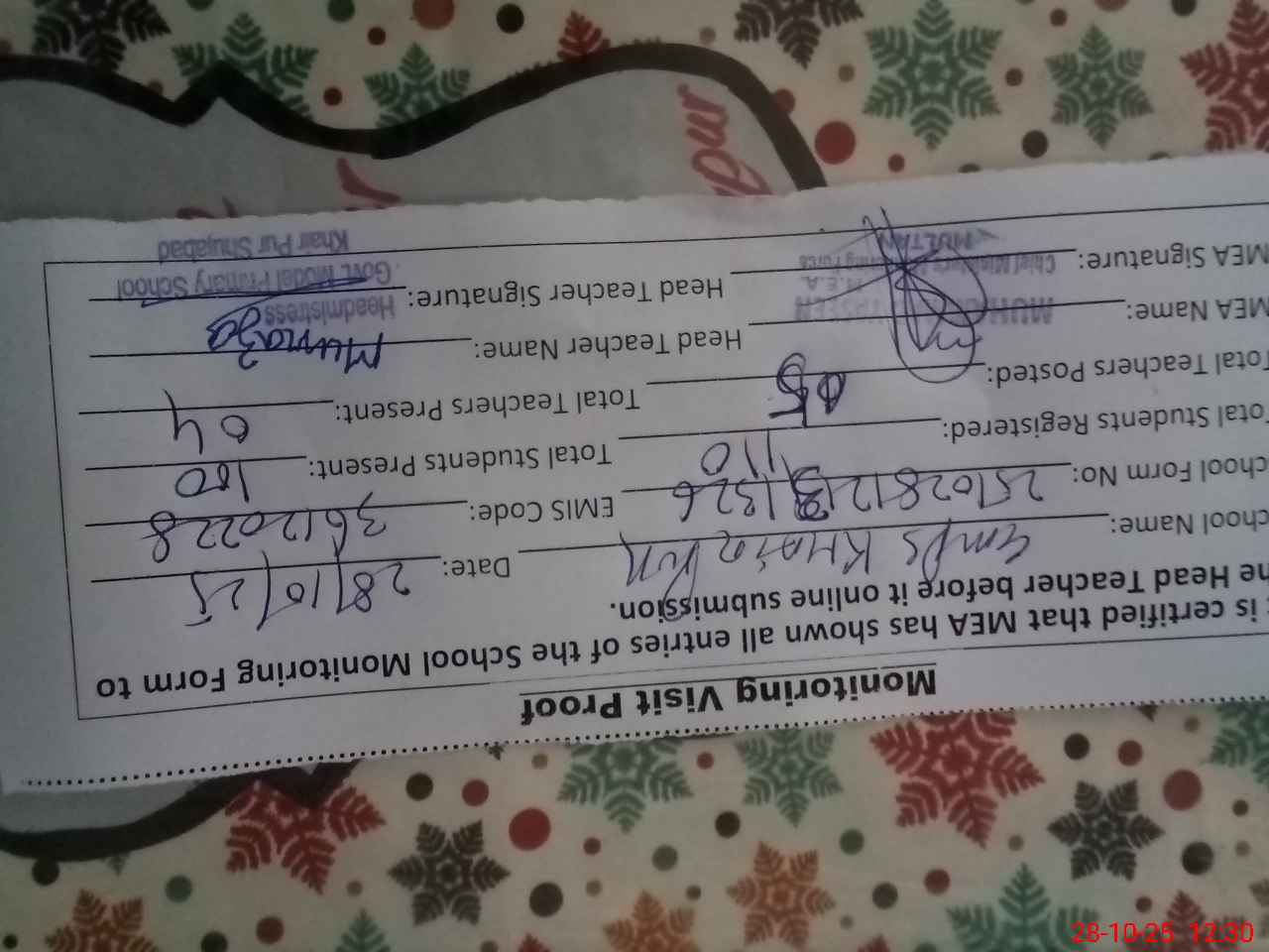 | Monitoring Date: 28-10-2025 | Start Time: 28-10-2025 12:13 PM | End Time: 28-10-2025 12:30 PM | Name of MEA: MU**** YA**** | |