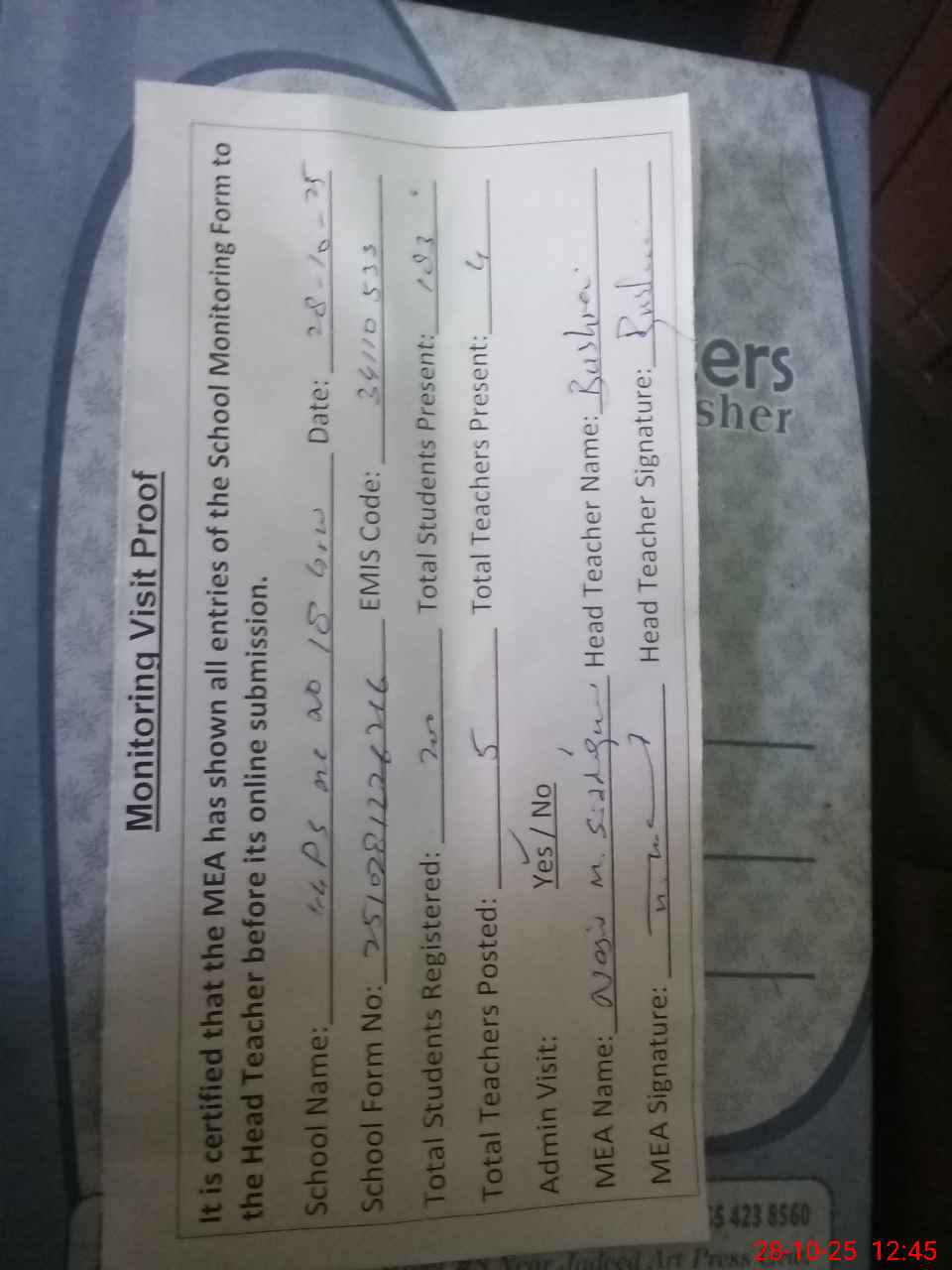 | Attendance Register | Head Teacher | MEA with School | Visit Proof |