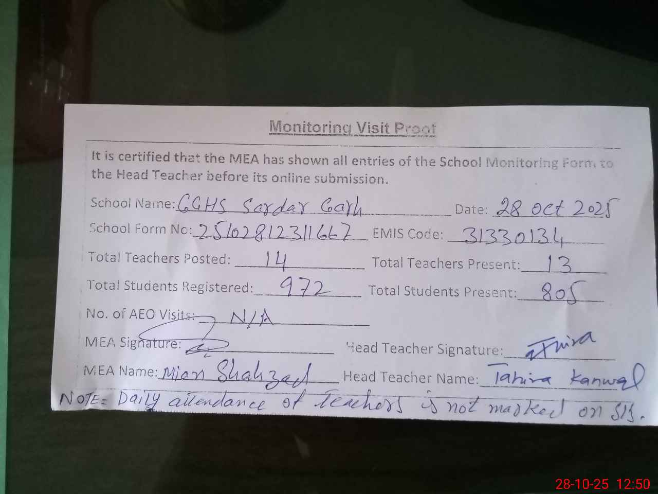 | Attendance Register | Head Teacher | MEA with School | Visit Proof |
