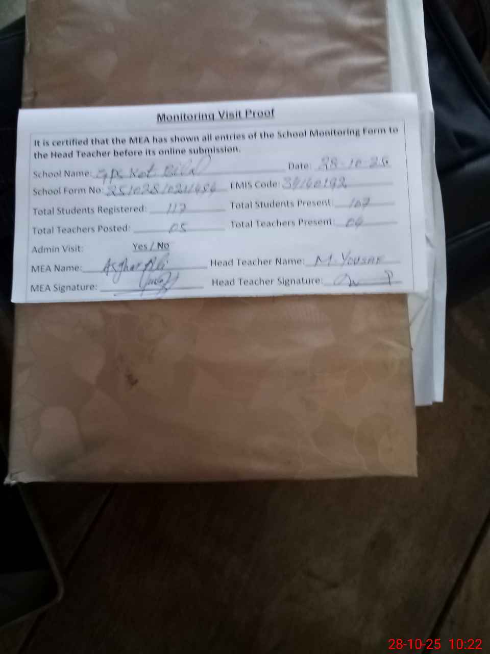 | Attendance Register | Head Teacher | MEA with School | Visit Proof |